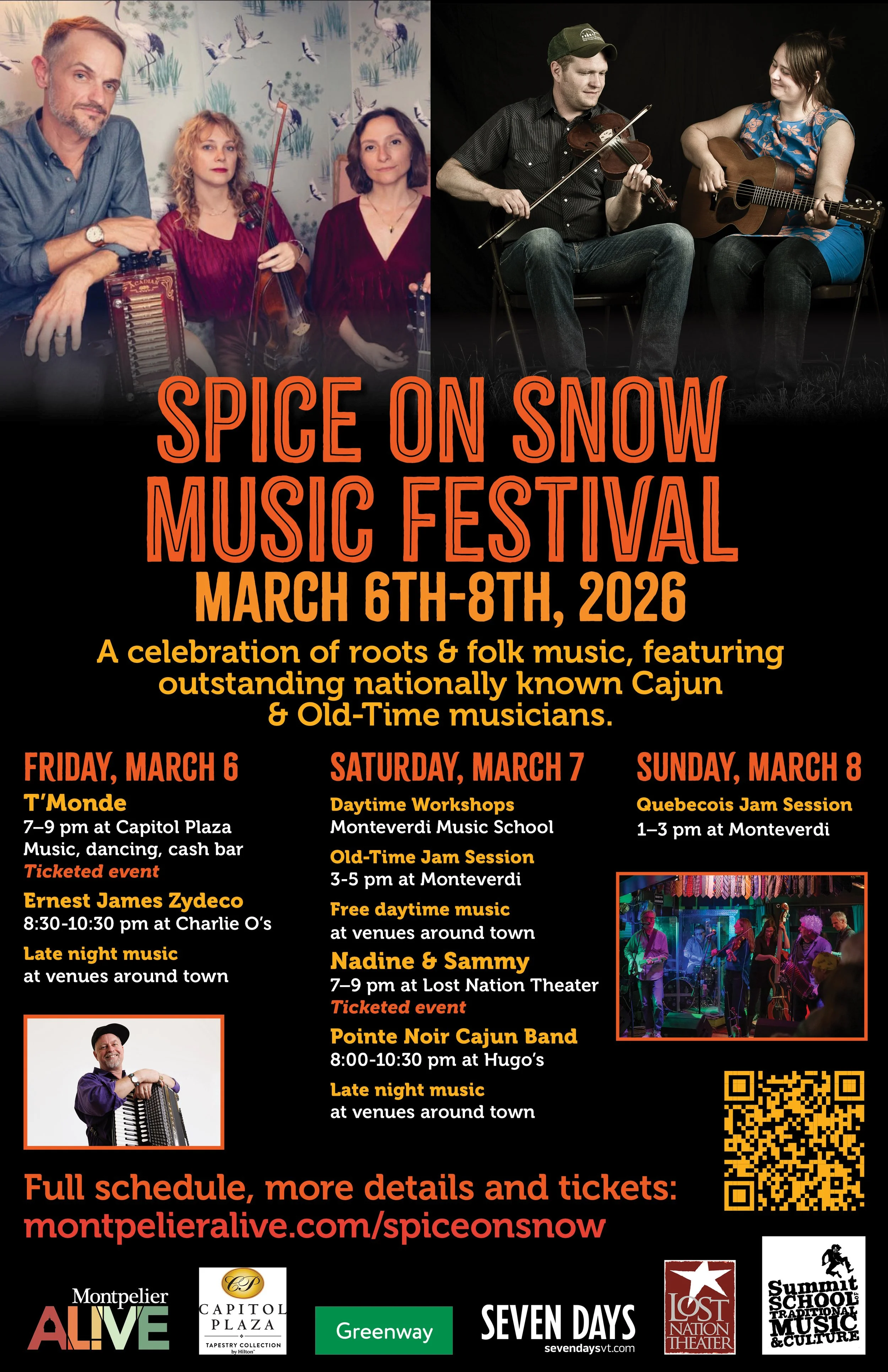 March 6-8: Pointe Noir (Chris’ Cajun band) @ Spice on Snow Old Time & Cajun festival. Montpelier, VT.